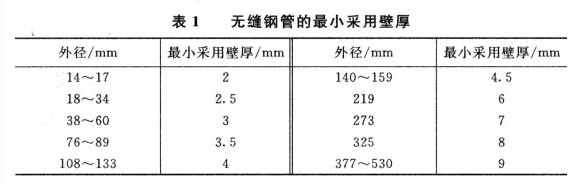 而無縫鋼管與焊接鋼管不同,同一外徑有許多種不同的壁厚,對于經常用的中、低壓管道,有一個最小采用壁厚的規定,見表1。