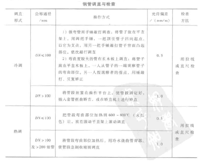 鋼管安裝后使用中被撞彎、壓扁;在運(yùn)輸、裝卸、堆放過程中產(chǎn)生彎曲,特別是規(guī)格較小的低壓流體輸送用焊接鋼管,更容易產(chǎn)生彎曲。為了保證鋼管正常使用,應(yīng)對鋼管進(jìn)行調(diào)直。彎曲度允許偏差和檢查方法見下表。